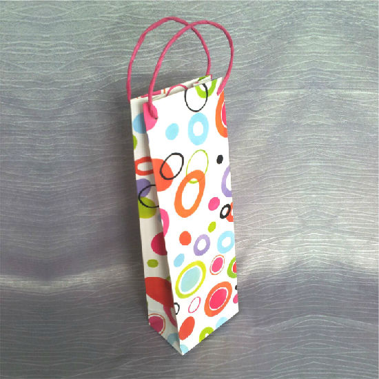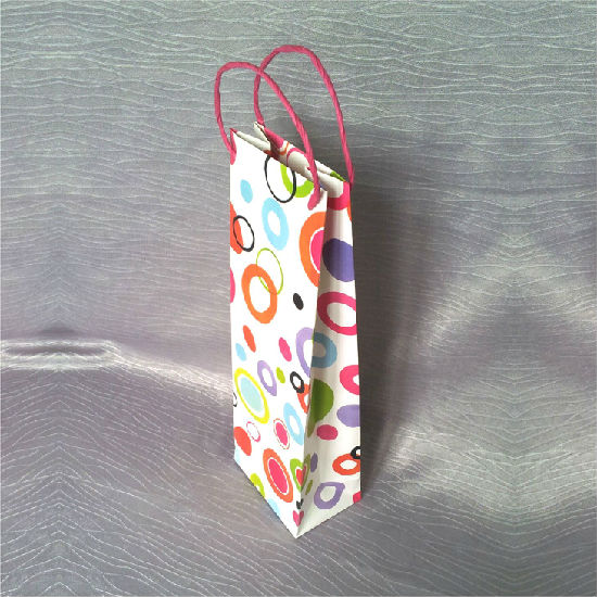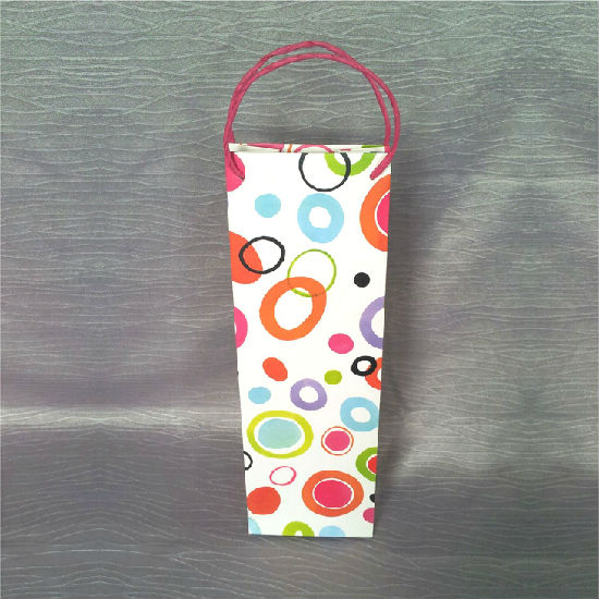 The wine bag is made of 170g white card paper. This piece comes in a slender shape. It is finished with precise colored printing.