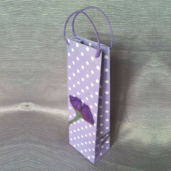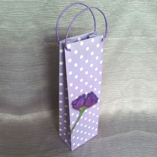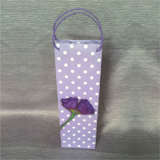 The wine bag is made of 170g white card paper. This piece comes in a slender shape. It is finished with precise colored printing.