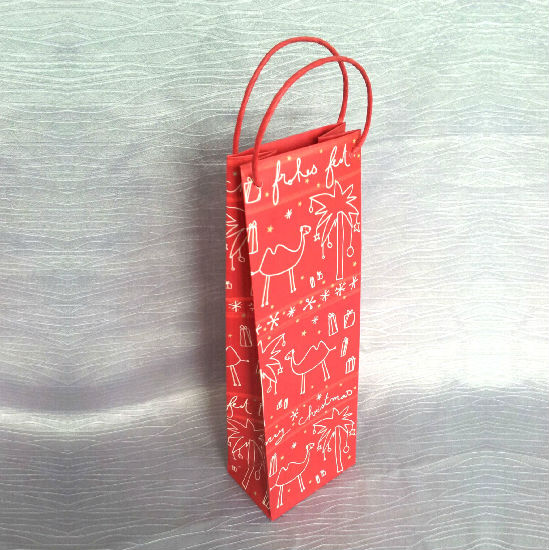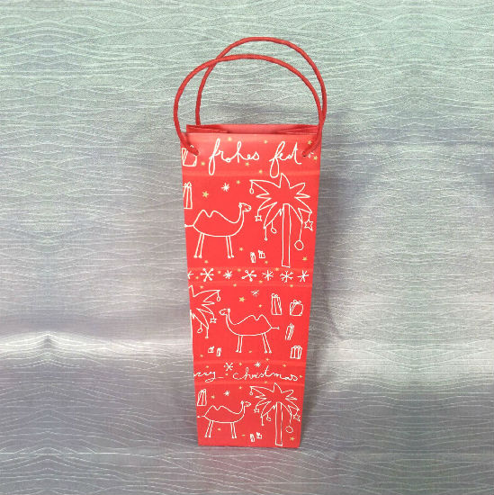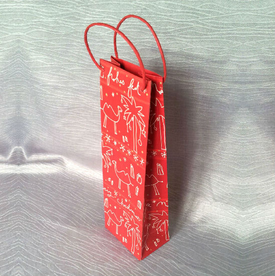 The wine bag is made of 170g white card paper. This piece comes in a slender shape. It is finished with precise colored printing.