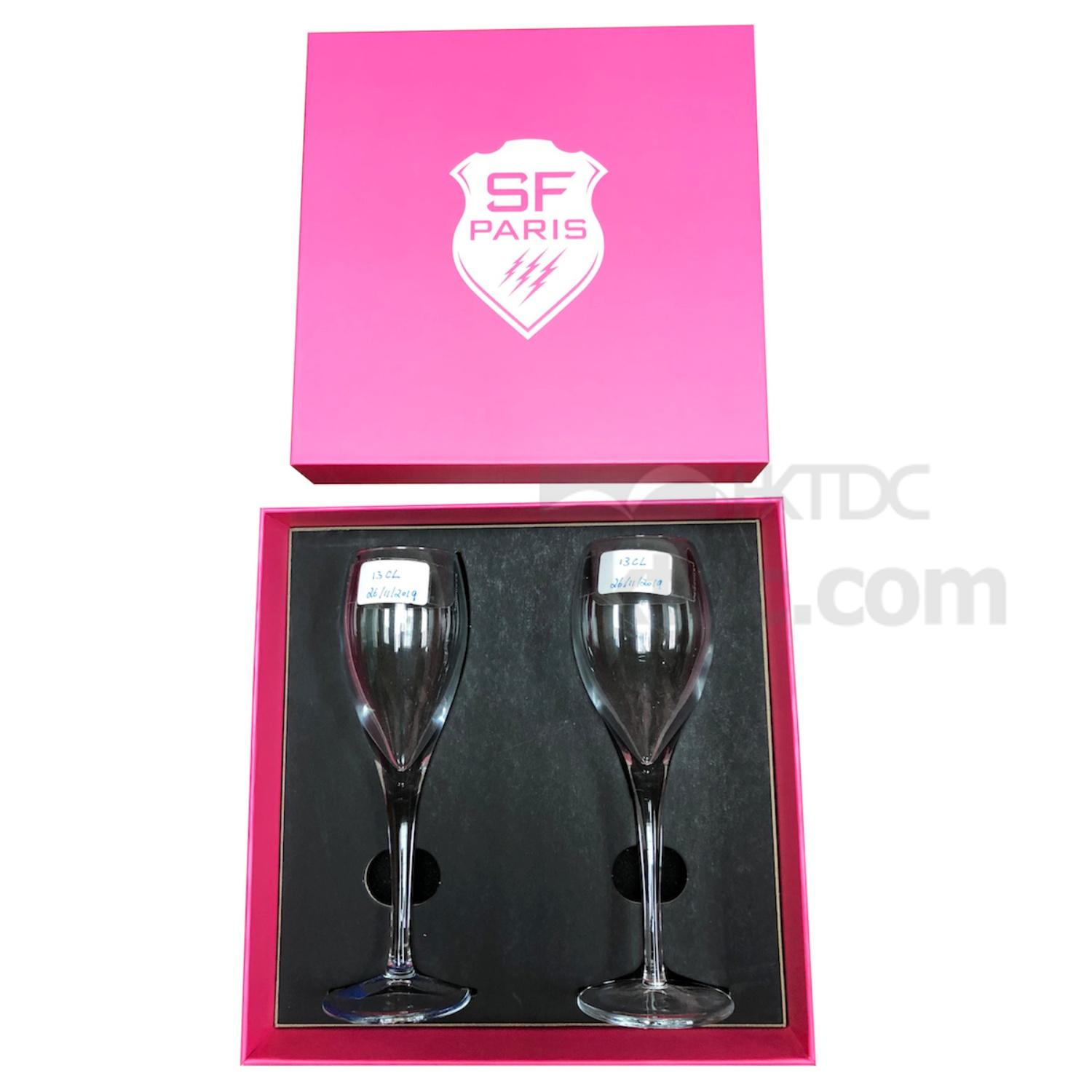 Remarks: this box is designed for wine glass packing. In order to secure glass, there is making a paper platform with die-cut the shape to fit with pair of glasses, placing 5mm foam at bottom on top respectively of inside outerbox to protect glasses in further.