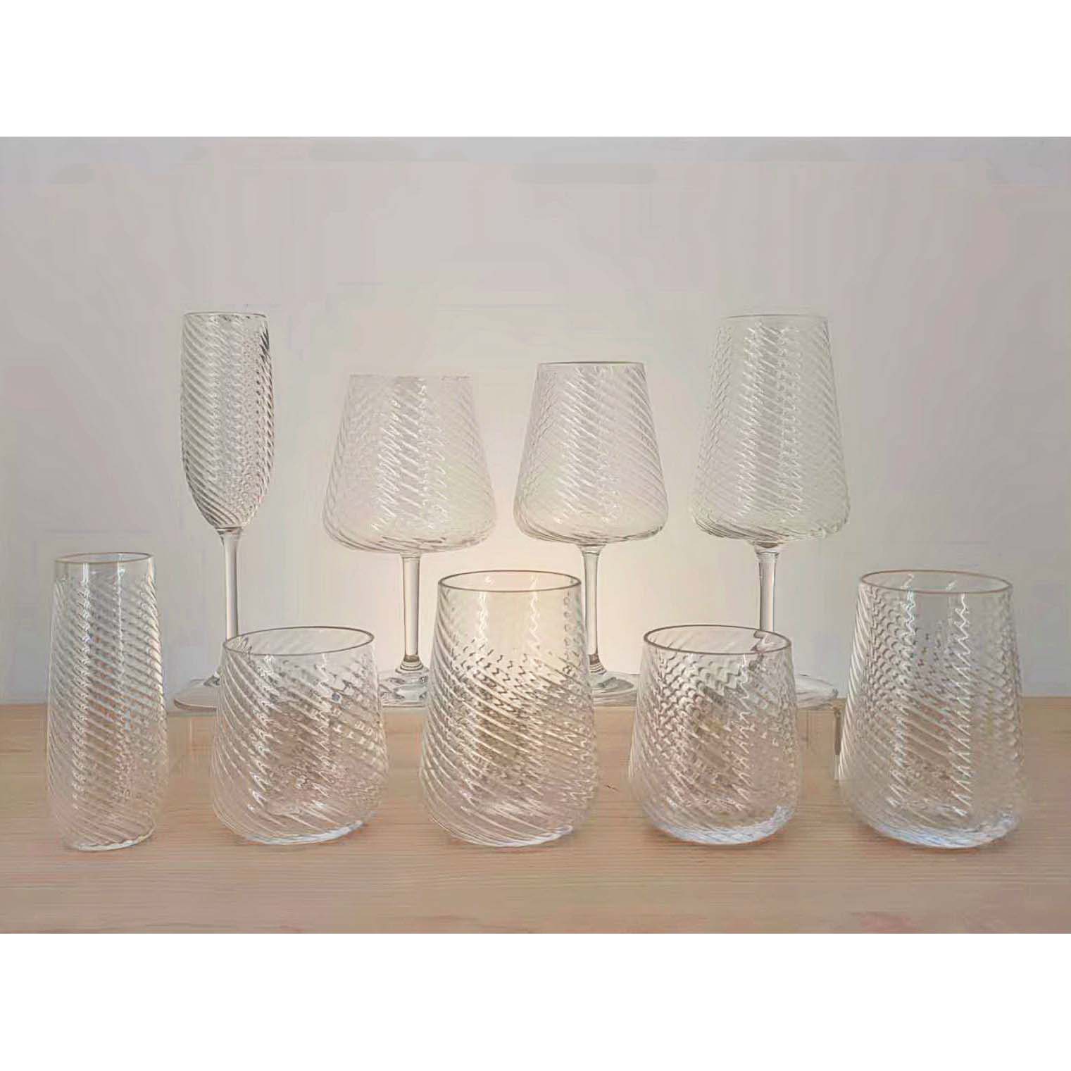 Elevate your dining experience with our sophisticated collection of premium plastic wine glasses featuring an elegant spiral pattern design. This versatile set offers precisely crafted vessels for every occasion, from generous 610ml red wine glasses to refined 155ml champagne flutes. Expertly manufactured using high-grade materials including Tritan, Polycarbonate, Acrylic, or MS, these glasses combine durability with sophisticated aesthetics. Each piece maintains the proper dimensions and capacity for optimal wine appreciation while providing a practical, unbreakable alternative to traditional glassware. The collection includes stemmed and stemless options, accommodating various serving preferences from formal gatherings to casual entertainment. The thoughtful design ensures proper aeration and presentation of beverages while maintaining an upscale appearance suitable for any dining setting.