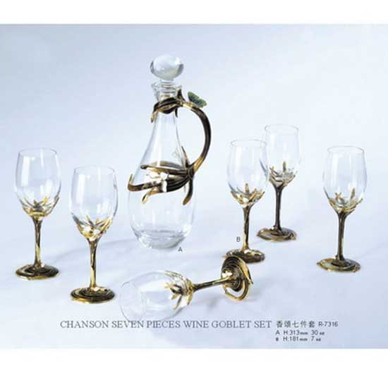 Highlighted is a wine glass set coming with 1 wine decanter and 6 crystal glasses. The golden decoration is made of pewter, and is colored with unfadable enamel. Impress your guests by serving them with these classy glassware.