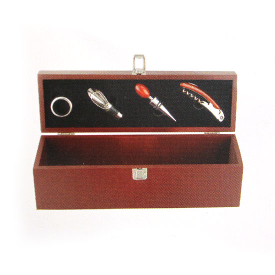 Presented is a nice set of wine tools boasting an elegant design. The tools include a corkscrew, a stopper, a pourer and a collar. All items are packed in a wooden box to make an impressive gift.