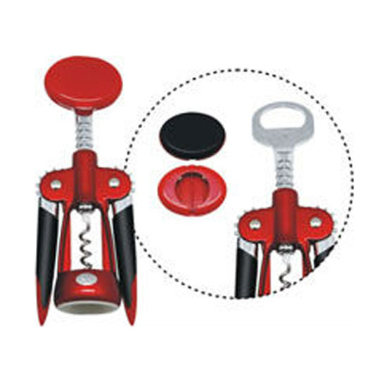 Featured is a winged corkscrew with extra foil cutter. The corkscrew features a zinc alloy metal handle and pole stainless steel spiral with non-stick coating. The corkscrew is finished in metallic coating body with customer brands logo.