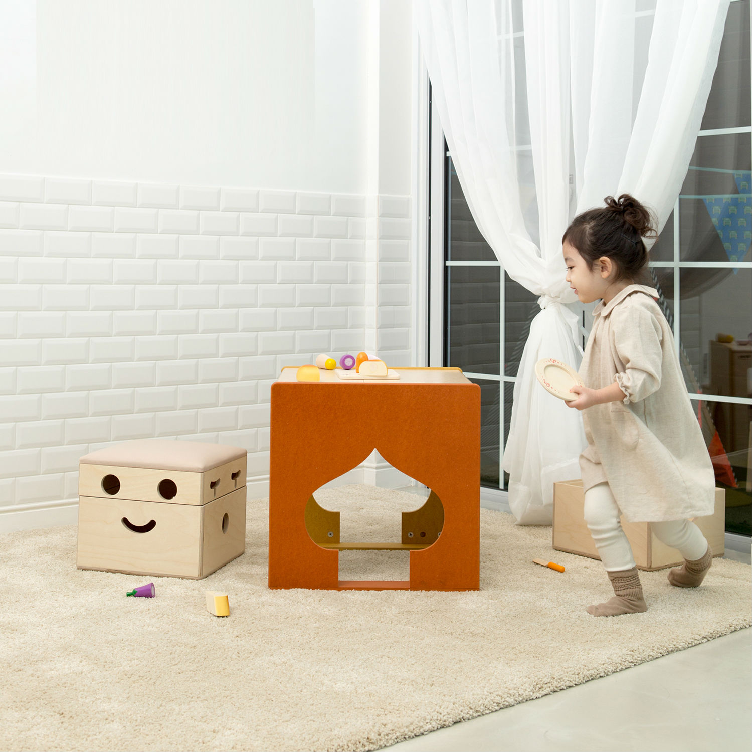 The Winky Desk is an enjoyable desk for kids. The Winky Desk features many different expressions with different combinations of the desk and the stool. The desk expresses the character's head and the stool expresses its face. The stool consists of a case and its cover. Four sides of the case shows four different mouth expression and four sides of the cover shows four different eyes expression. Thus, kids can make sixteen different face expressions by themselves. The Winky Desk will provide a new and joyful way of communication between kids and parents.