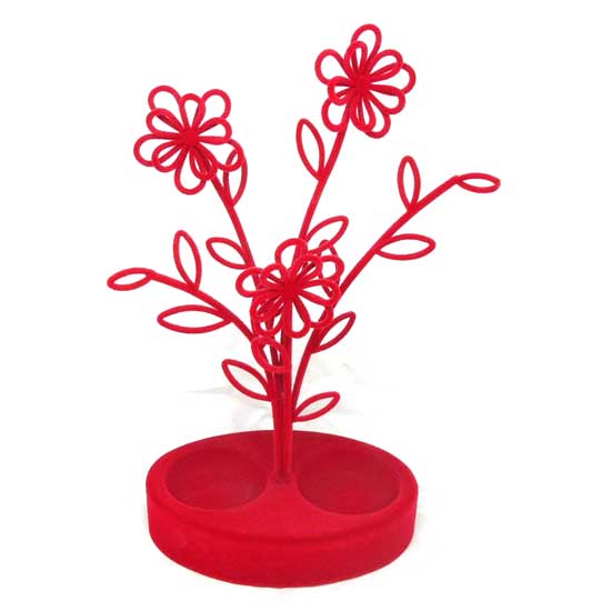 Featured is a jewelry display stand wired into a floral design. The velvety red is sure to support the gleams and sparkles from your jewelry with style. This jewelry stand allows you to have a truly personalized display of your favorite jewelry items.