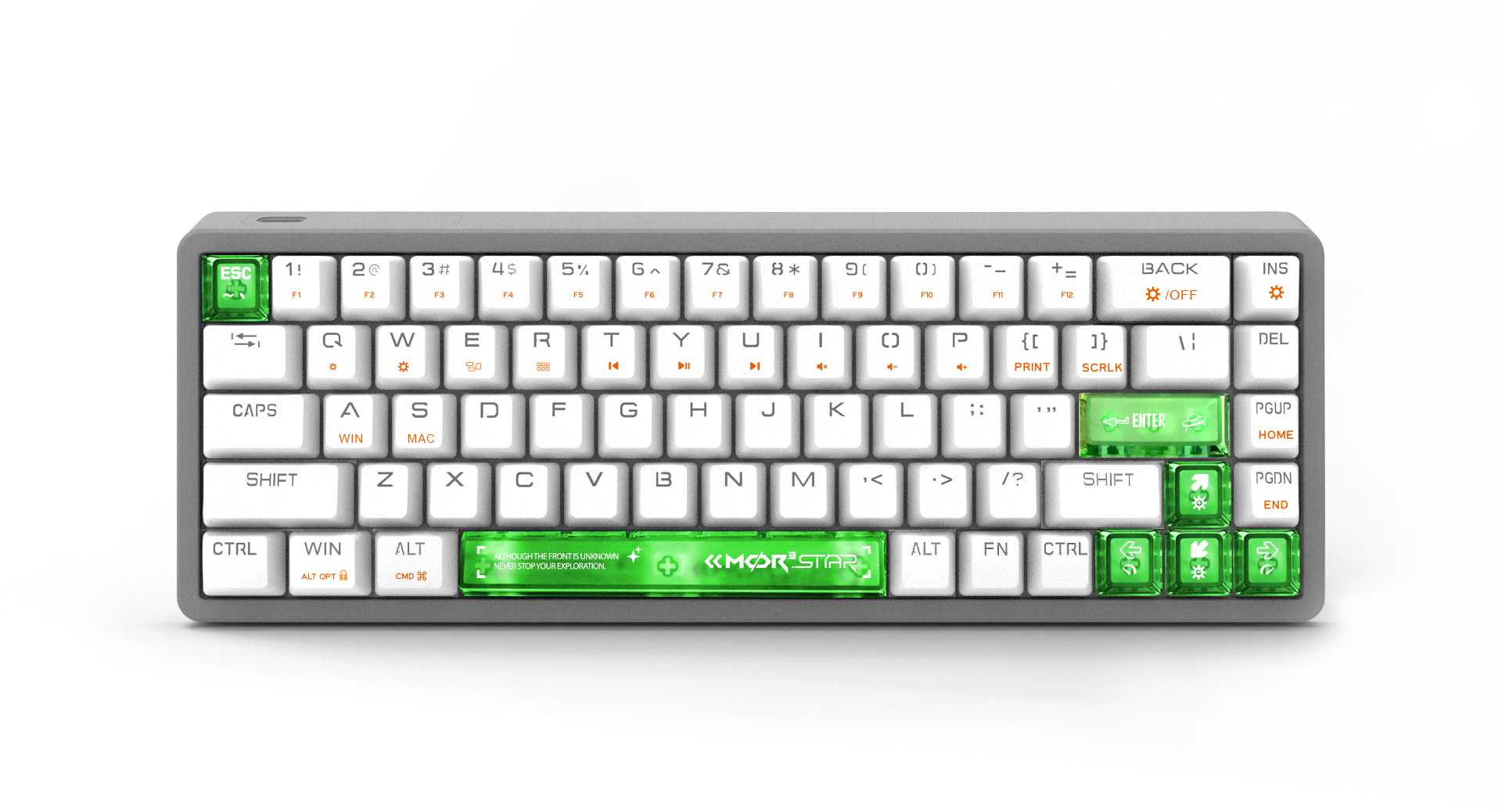 Keycaps: white dural color Injection keycaps + 7 pcs transparent green color keycaps