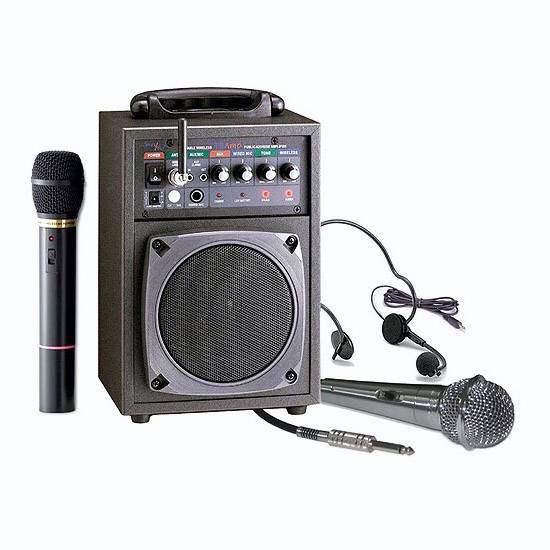 This portable wireless amplifier features a 30-watt amplifier with a wired and wireless microphone. It is equipped with 3.5mm aux-in and -out circuitry. This complete and all-in-one wireless PA system offers professional crystal-clear acoustic sound and wireless transmission.