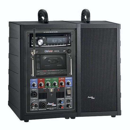This portable wireless amplifier features digital echo effect and voice priority, which overrides external music sound through the AUX input. It is compatible with DVD, SVCD, CD-RW, MP3 and CD formats. This complete and all-in-one wireless PA system offers professional crystal-clear acoustic sound and wireless transmission.