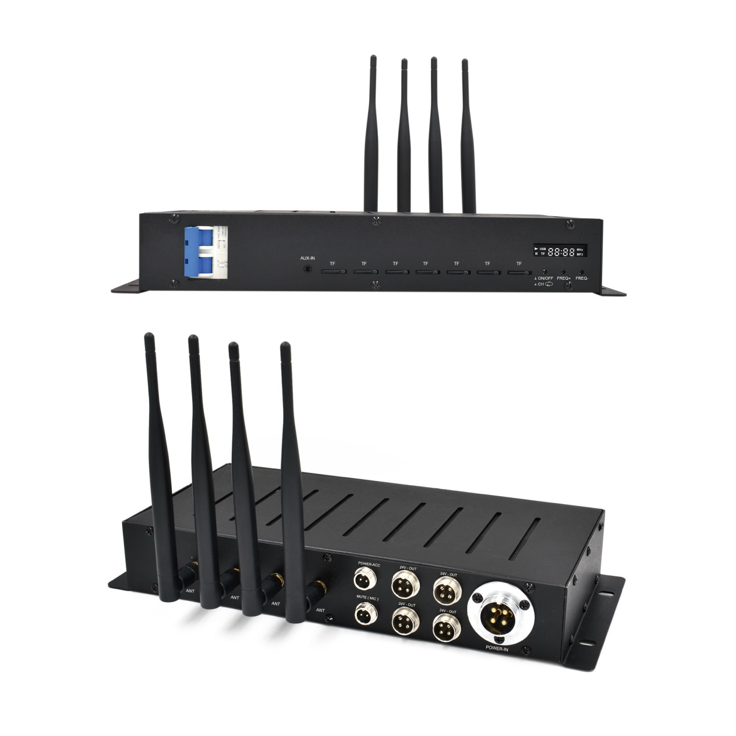 • This audio server uses the latest adjustable FM frequency technology, has 7-channel built-in audio sources(supporting 7pcs SD cards) and 1 channel audio input. It also supports announcement from our special microphone.