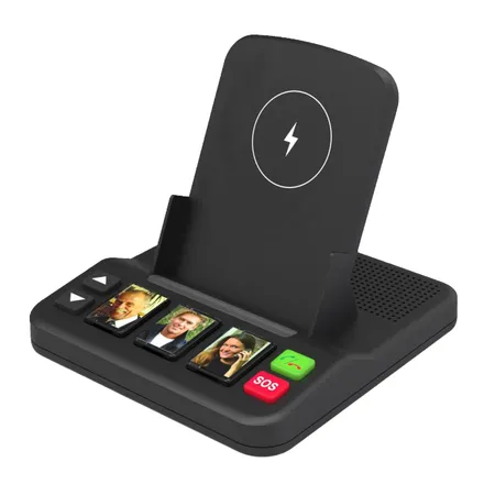 This simplistic wireless charging stand is designed with seniors in mind. Users can initiate charging by placing a smartphone vertically or horizontally on the stand. This charging stand includes three photo dial buttons for quick access, a rear speaker with adjustable volume, and an SOS emergency button to enhance safety.