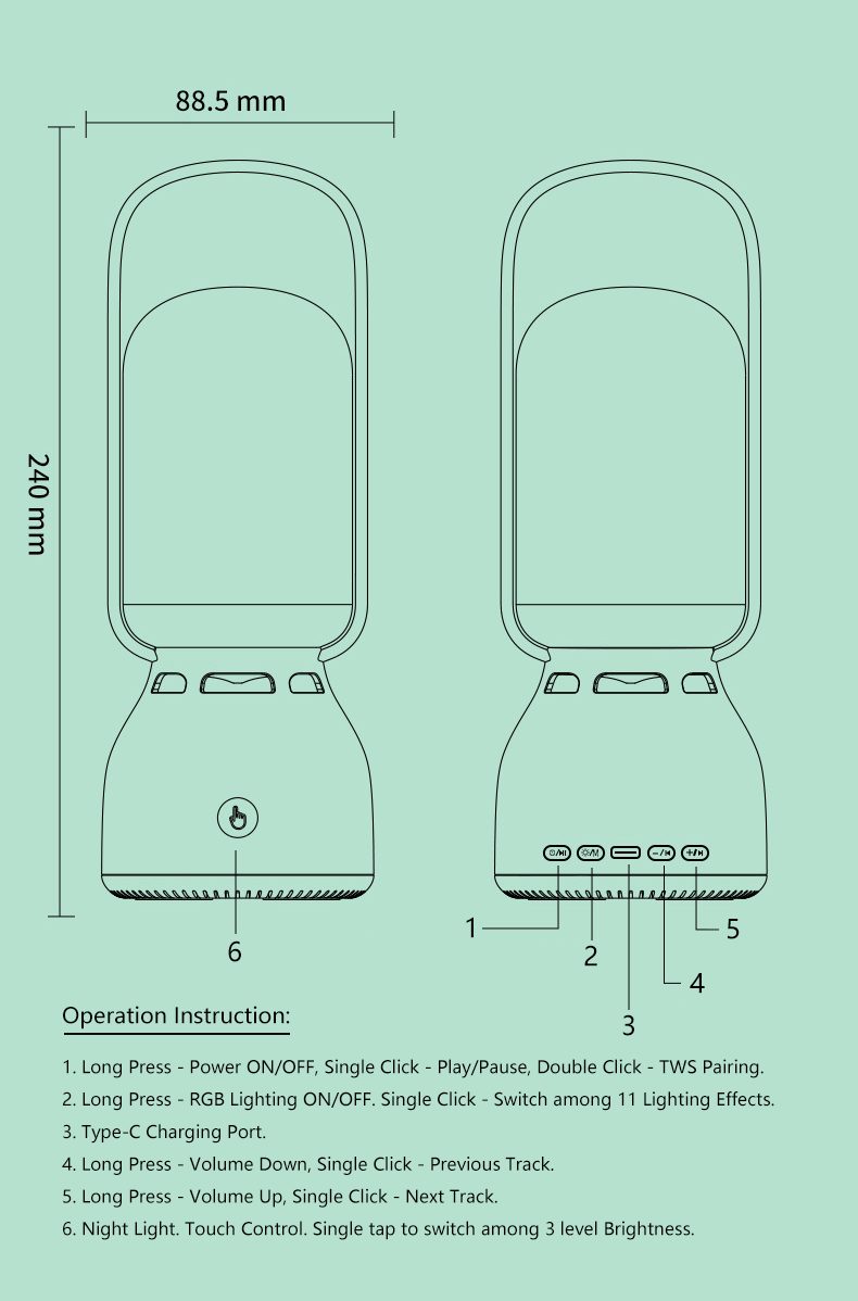 Function: BT, Volume Up/Down, Previous Track / Next Track, Touch Control, RGB Lighting, TWS