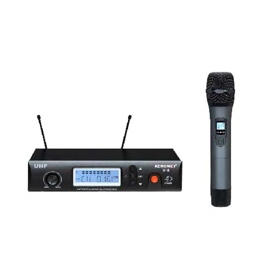 This wireless microphone system features a unique design with powerful dynamic and wide frequency response. It is flexible, simple and convenient to operate. With an LCD display screen, it is the perfect choice for KTVs and other applications.