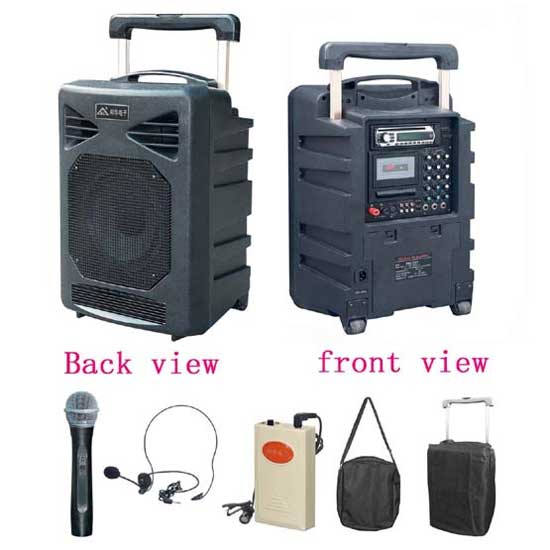 This amplifier comes with 3 wired microphone inputs with 3 priority functions, 1 balance input and 2 routes for RCA jacks for 2 AUX inputs. The device can be connected to sources like CD, VCD and cassette players and AM/FM radio. It also comes with USB and SD card slots as well as ports for two wireless microphones. Designed with wheels and a handle, the amplifier is great for outdoor use.