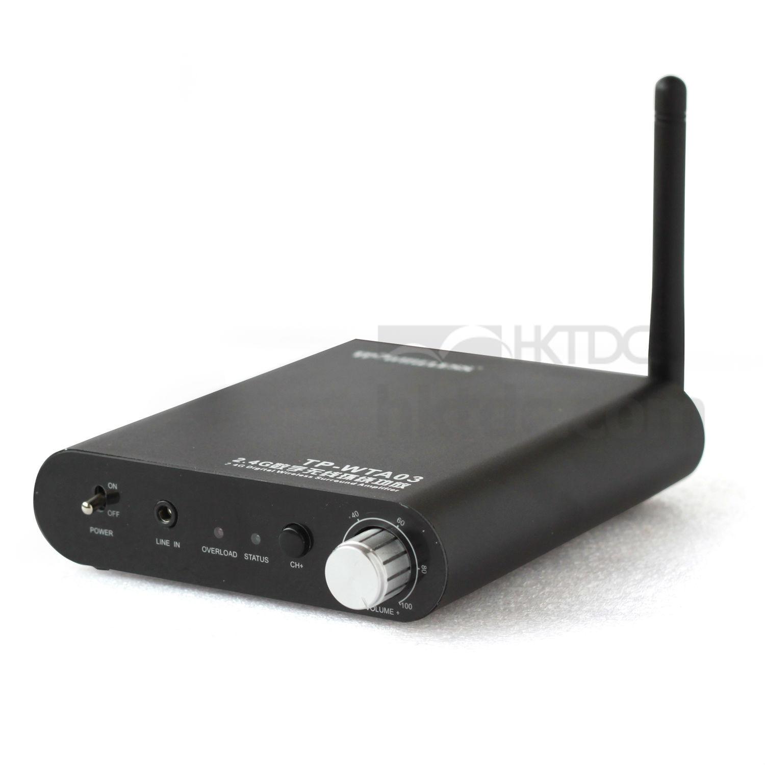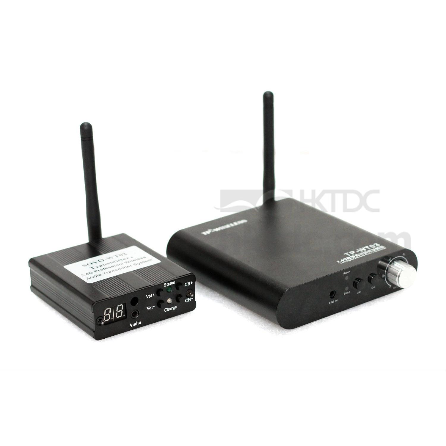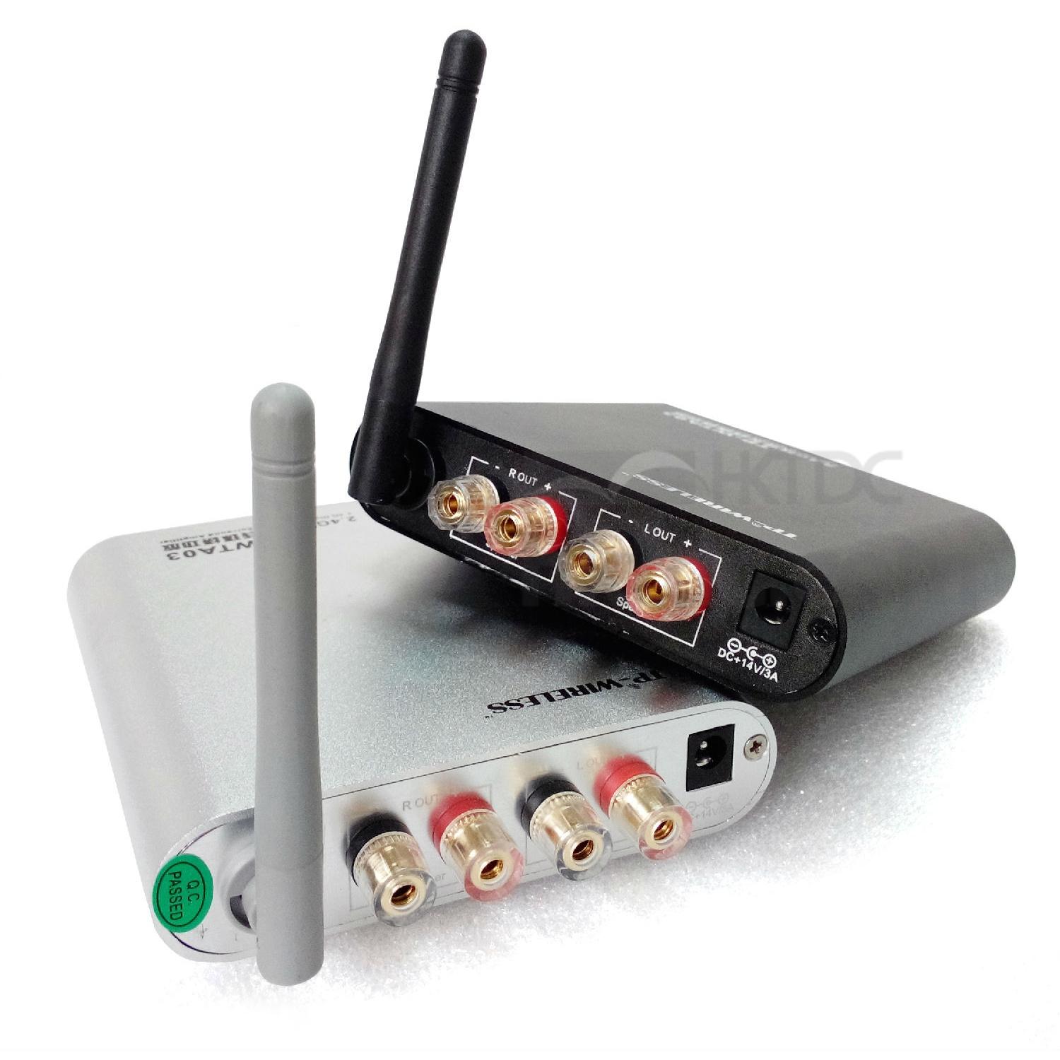 One 2.4GHz wireless transmitter (connecting with audio source, Line-in/amplifier level input) and one 2.4GHz wireless surround amplifier (connecting with rear-passive-speaker).