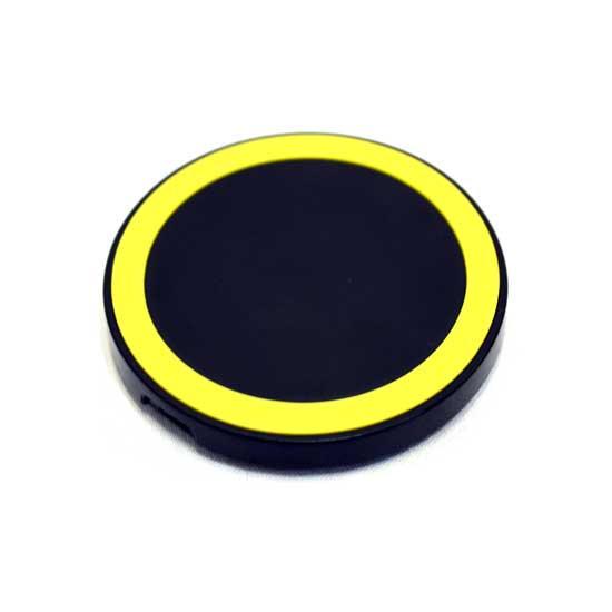 This is a wireless power bank with a stylish design. It comes with an eye-catching black-and-yellow appearance and is designed in a circle shape. This power bank is suitable for various electronic devices.