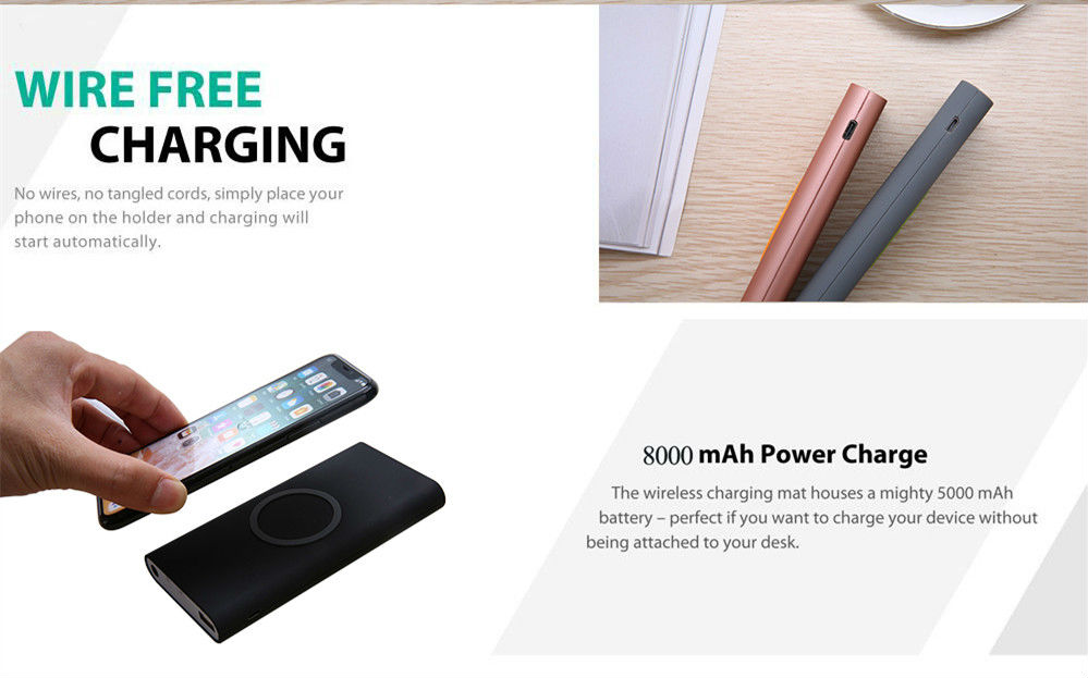 Wireless power bank, With 2 input ports (1 x micro port and 1 x type c port), can be 6000mah, 8000mah,10000mah, indicator light, wireless QI stand, charge 2 phones at the same time. easy to carry. Price is more cheaper than other wireless power bank. suitable for all smartphones.