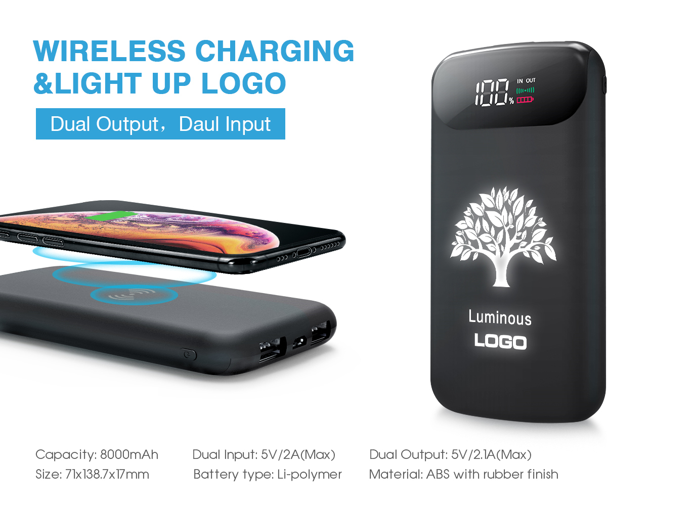 Wireless Power Bank with Light Up Logo and LCD Display from BSCI Factory