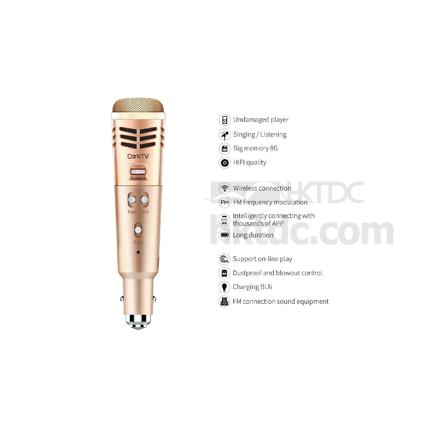 - CARKTV is a vehicle-mounted karaoke product that is used in the car and integrates 4 functions of “Local listening mode”, “Local singing mode”,“Listening via Bluetooth” and “Singing via Bluetooth”. It has 8G built-in memory card, the user may copy songs, accompanying music or other audios by himself, and it adopts cigarette end lighter design and realizes wireless charging and integration with the car. In addition, its tail is also equipped with the function of the emergency hammer to safeguard safety travel of car owner.