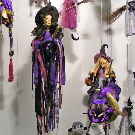 These witch figurines make great Halloween decorations for all homes and offices. The witch figurines are delicately designed and handmade. The witches are dressed in a purplish blue dress, with a black hat and sitting a broom. These witches decoration can be easily hung on ceilings.