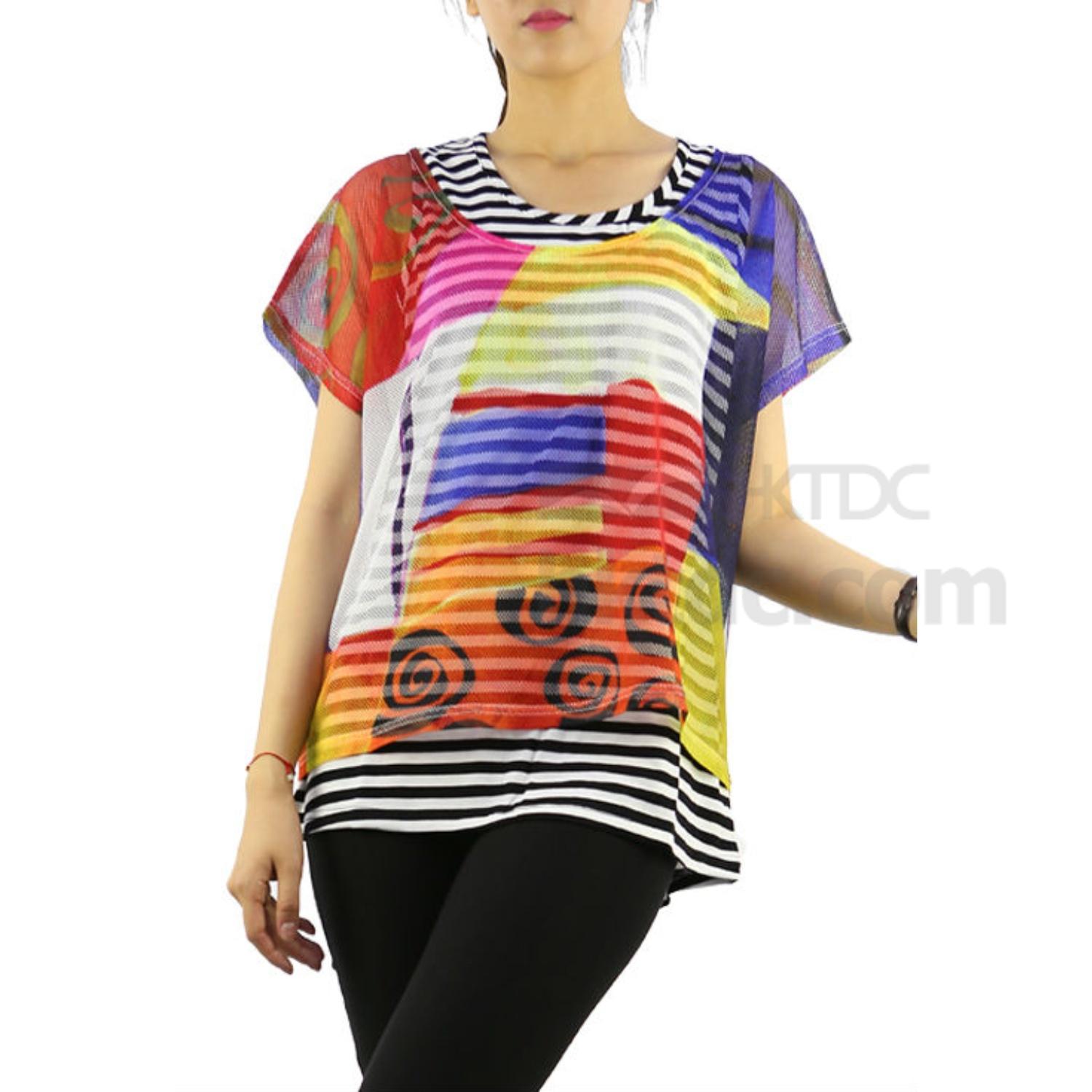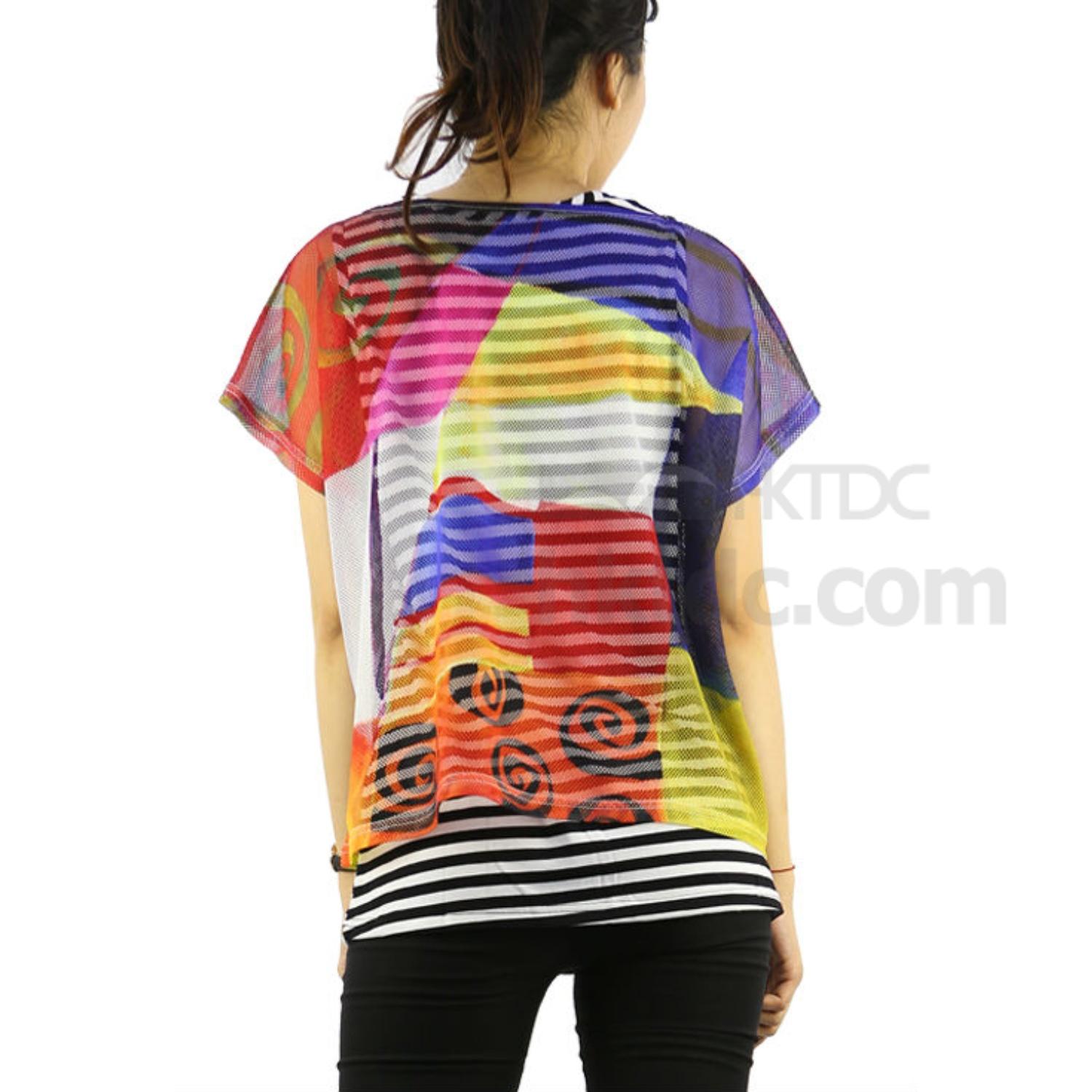 • This t-shirt is made of eyelect mesh and stripe fabric.