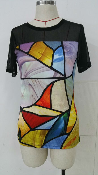 • Women printed T-shirt with mesh decoration in top and sleeves.