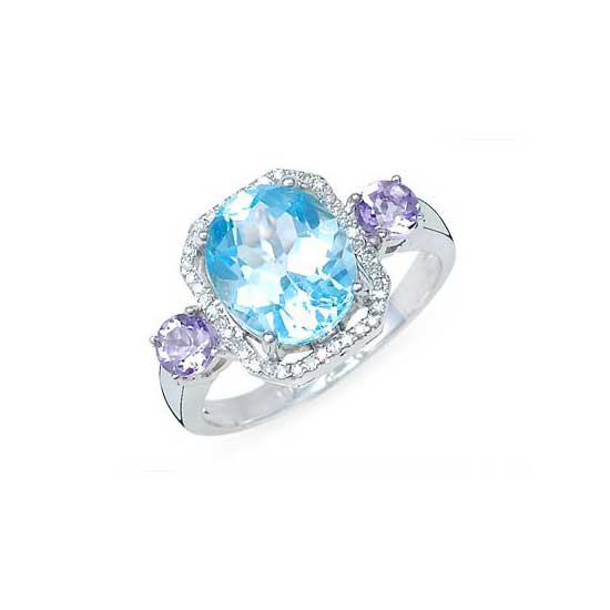 Indulging your beloved one with this sparkling gemstone ring is a heavenly surprise. Forty small pieces of round diamond are arranged on a rectangular frame with an oval-shaped sky blue topaz inlaid. Two round amethysts are placed on either side of the frame. This finely polished 14-carat white gold ring is simply gorgeous.