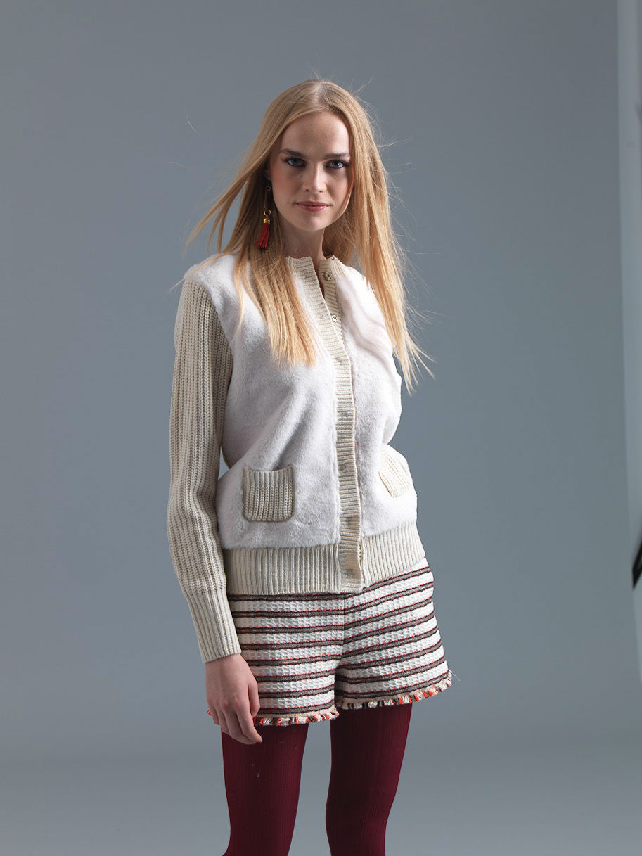 Upgrade any wardrobe with this furry cardigan for winter. This monotone long-sleeved outwear looks particularly tactile with its synthetic fur-covered bodice, ribbed sleeves and dainty side pockets. Fastened with button placket in the middle, this knitwear retains heat and provides wearers with added warmth.