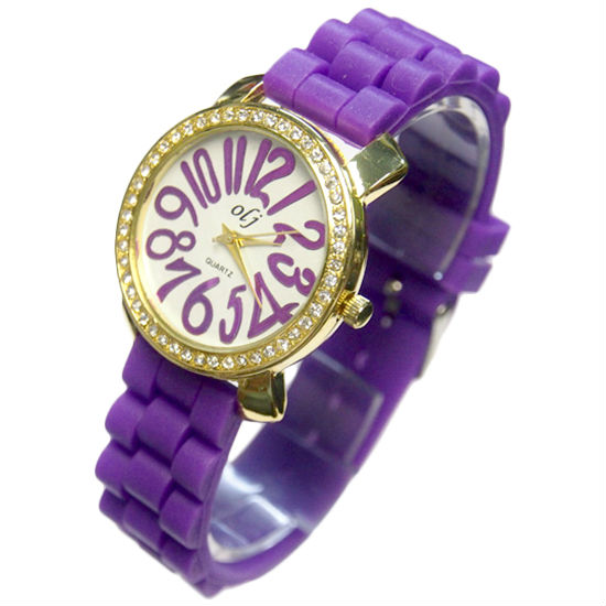 • Artistic Arabic numeral hour markers in purple at every hour position.