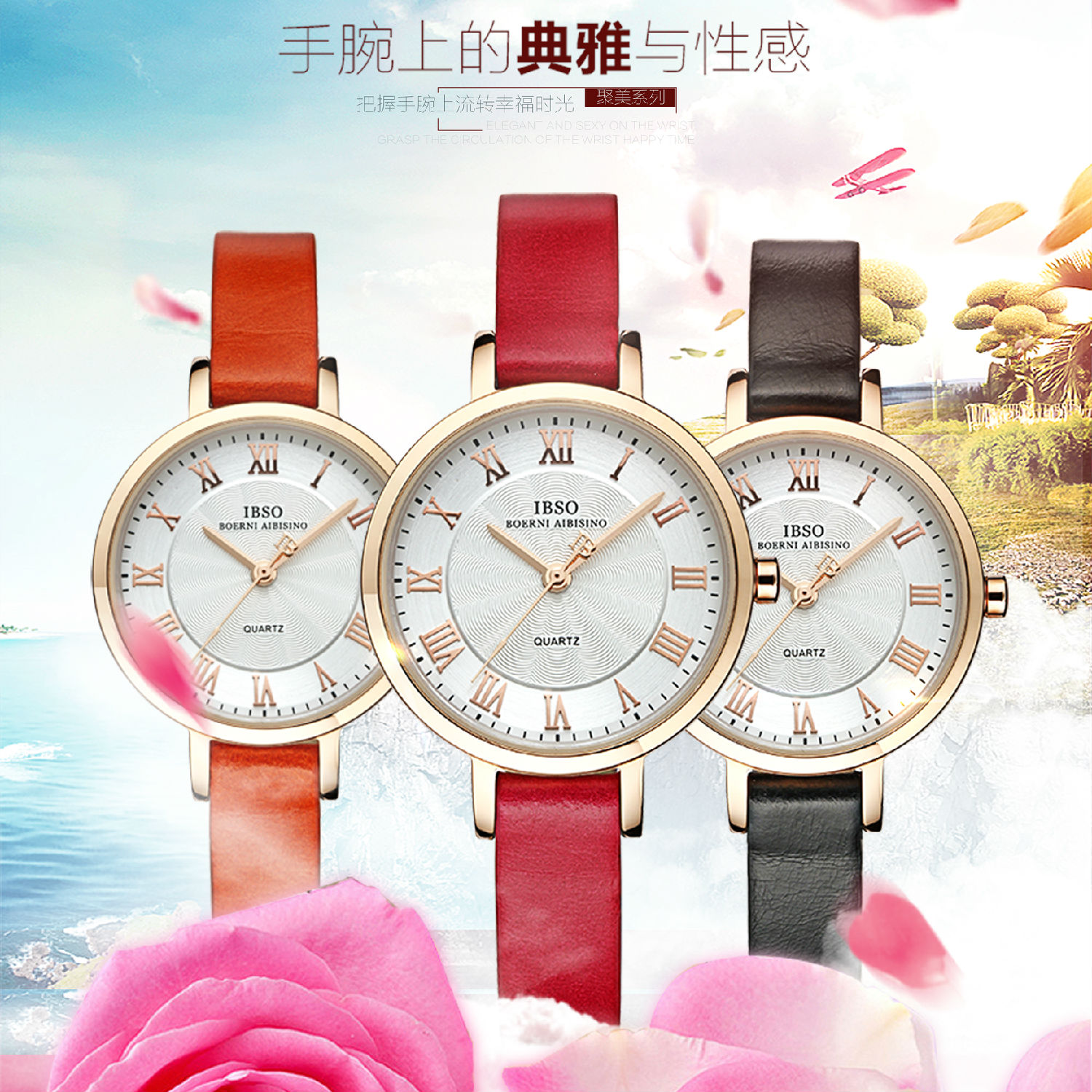 Watch brand:IBSO Watch style:Fashion Casual Movement:Japan quartz Miyota 2035 Case material:Alloy Case color:Rosegold Strap material:Genuine leather Strap color:Orange, red, grey Water construction:3ATM
