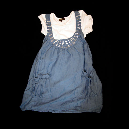 This women’s 2-piece casual wear set consists of a clean white top and a grayish blue dress. The embroidered neckline and straps lend a girlish touch to the appearance. The stylish dress is designed with two pockets on the front for added style and functionality.