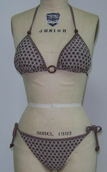 The featured bikini showcases an up-to-date hip by the tinge of brownish color, matching with small floral patterns for a gorgeous look. Details like bead decorations on the halter string and the tie-ups over the brief further add values to the swimwear.