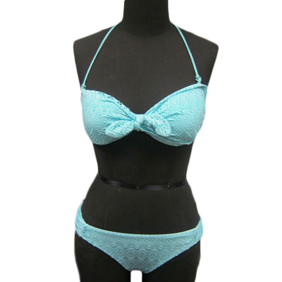 This is a women's bikini that comes in a light blue color. The top features a halter-neck design for a fashionable look. This bikini is made of high quality material for comfortable wearing.