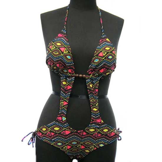 This women's bikini comes with a fashionable pattern. The two pieces are connected with elastic stripes, showcasing a flattering body shape. This bikini is made of high quality material for your comfort.