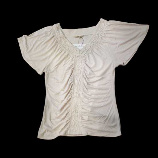 This white women’s blouse comes with a V neck and wide short sleeves. The floral motifs along the neckline and central line bring out extra style. Made of viscose and lycra, this simple yet stylish blouse bestows gratifying wearing comfort.