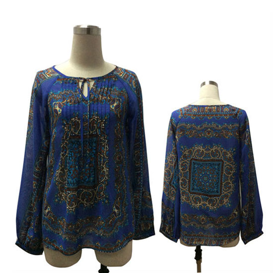This long-sleeved blouse is designed for fashionable women. It is made of quality chiffon for a comfortable touch. This ladies’ blouse comes with overall prints for an eye-catching look.