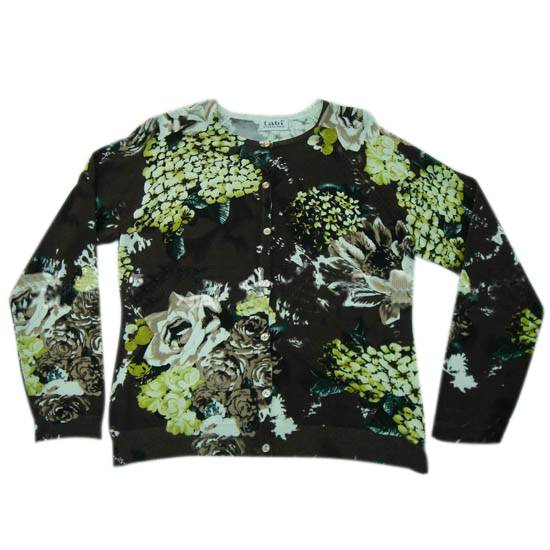This is a long-sleeve knitted cardigan for mature ladies and women. The black cardigan has a round neckline and features a pattern of yellow, brown and white roses to create a refined and elegant style, which is suitable for wearing to work and for leisure.
