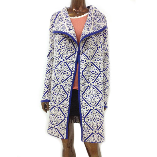 This is a women's cardigan that comes in a long length. Featuring blue jacquard patterns, this cardigan flaunts an elegant style. The oversized lapels add a fashionable touch to the piece.