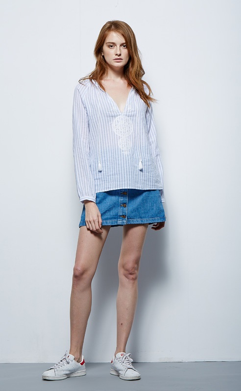 • This item is a V neck blue stripes blouse, the fabric is very light and made with 100% cotton. This blouse has embroidery and cotton pompon. The cotton drawstring can be attached together to make a round neck.