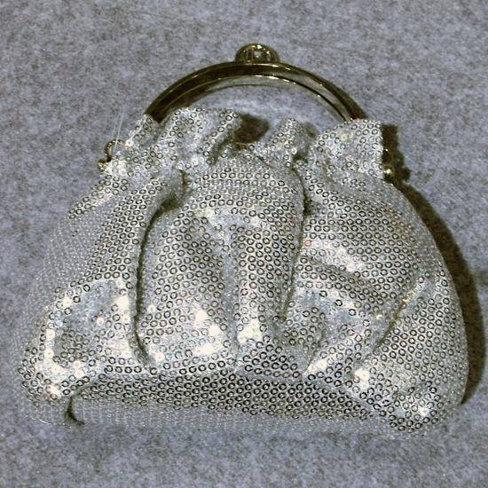 This fashionable clutch comes with a metal frame and snap closure on the top. The pouch-like bag features silvery sequins throughout. It has a detachable silvery-tone chain handle. It makes an elegant addition to your bag collection.