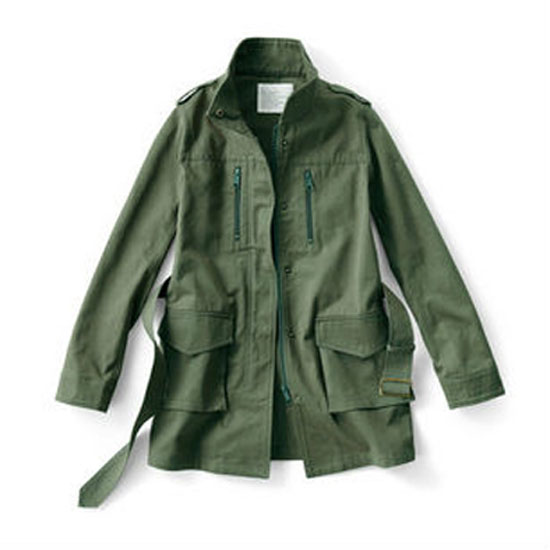 Pictured here is a women’s coat in army green, conveying a sense of vogue. The front is configured with multiple pockets for added functionality. The fashionable coat is finished with buckled straps at the waistline.