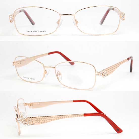 This pair of eyeglasses features a full-rim design with rectangular rims. The engraved temples are embellished with Swarovski crystals. This pair of crystal eyeglasses looks perfect for sophisticated ladies.