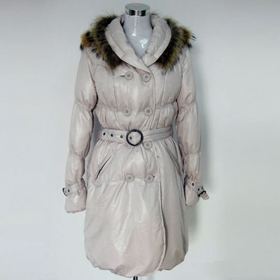 This down-filled winter coat allows you to stay warm and stylish in the cold weather. The hood and the collar are lined with natural fur for a feminine touch. Its waist is gathered with an adjustable belt, showcasing the wearer's nice figure.