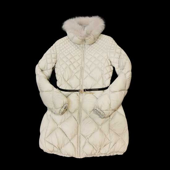 This is a women's down coat with padding. Designed with a fox fur collar, this down coat is extra warm and flattering. A decorative thin belt in black adds a fashionable touch to the garment.