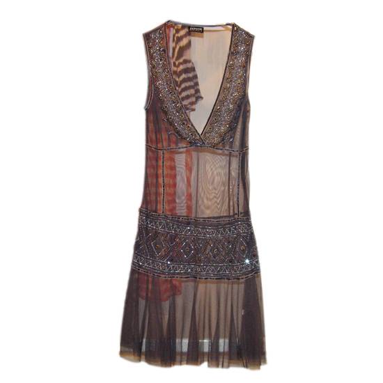 This is a women's dress in Indian style. The dress is sleeveless with deep V-neck. It is sheer with underlayer.