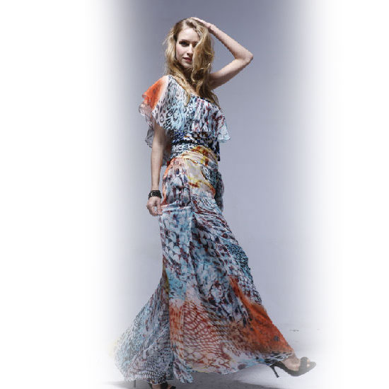 This women's fashion evening dress comes with beautiful patterns in orange and blue. It is made from high quality silk to offer a lightweight construction and a see-through visual effect. It is perfect for semi-formal occasions and parties.