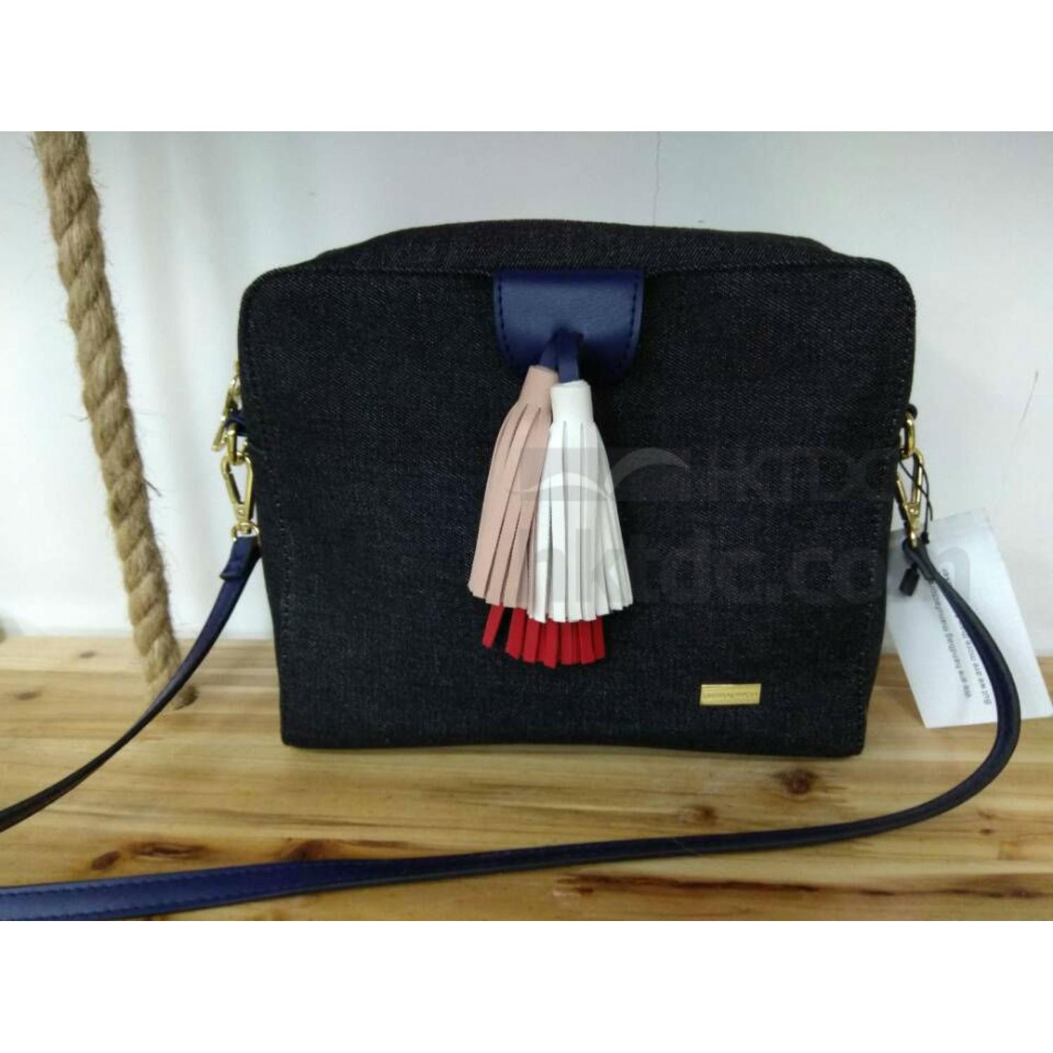 Classic quadrilateral craft pairs a slim shoulder strap to present you this women’s handbag. It highlights a triple-tassel adornment in front, boasting a lighthearted look with elegance. The top zip fastening further promises secure storage of your everyday essentials.