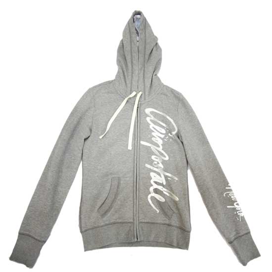This women's jacket features a neat design of a white word printing on the front. The comfortable fabric and two outer pockets characterize this practical jacket. Dress up casually in style with this gray-and-white hoodie.