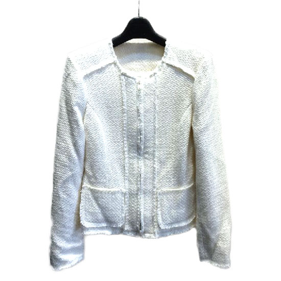 This is a ladies' jacket with a fashionable design in white. It is made of high-quality material with excellent workmanship. This jacket is easy to mix and match with different kinds of trousers and skirts.