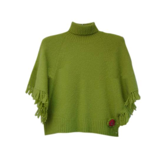 The featuring cloth is a grassy green knitted pullover with a stand neck for ladies and women. The long and wide wing sleeves have fringes at the end to produce a wavy feeling, which is elegant and fashionable in style at the same time.